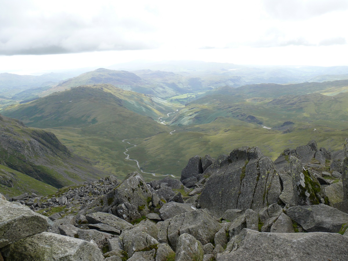 Langstrath is the valley to the right, the dark fells in the distance are Skiddaw (l) and Blencathra (r). The stony ridge in front of me is Hanging Knotts as I reach the summit of Bowfell