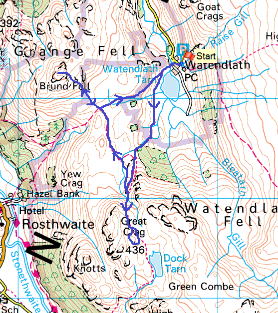 | Route – Watendlath Tarn – Great Crag – Puddingstone Bank – Grange Fell – Watendlath |