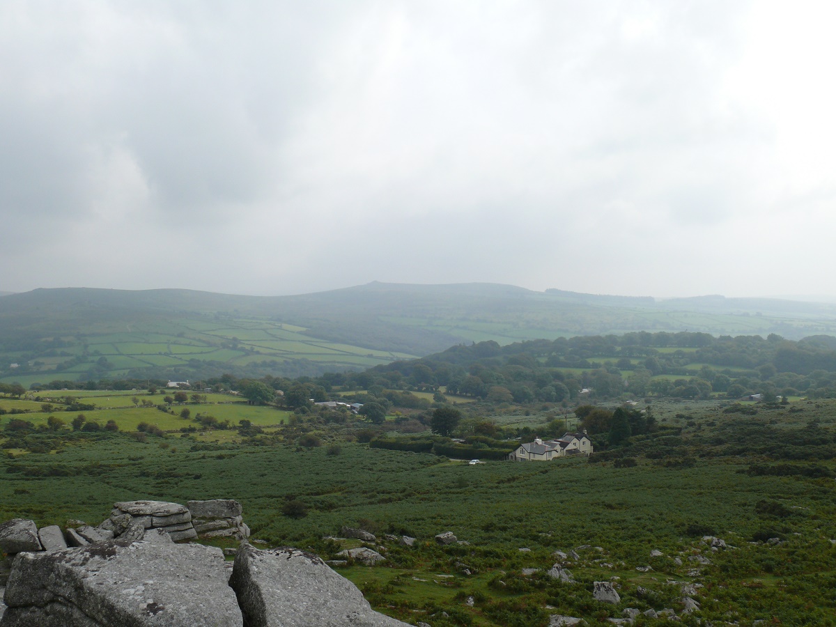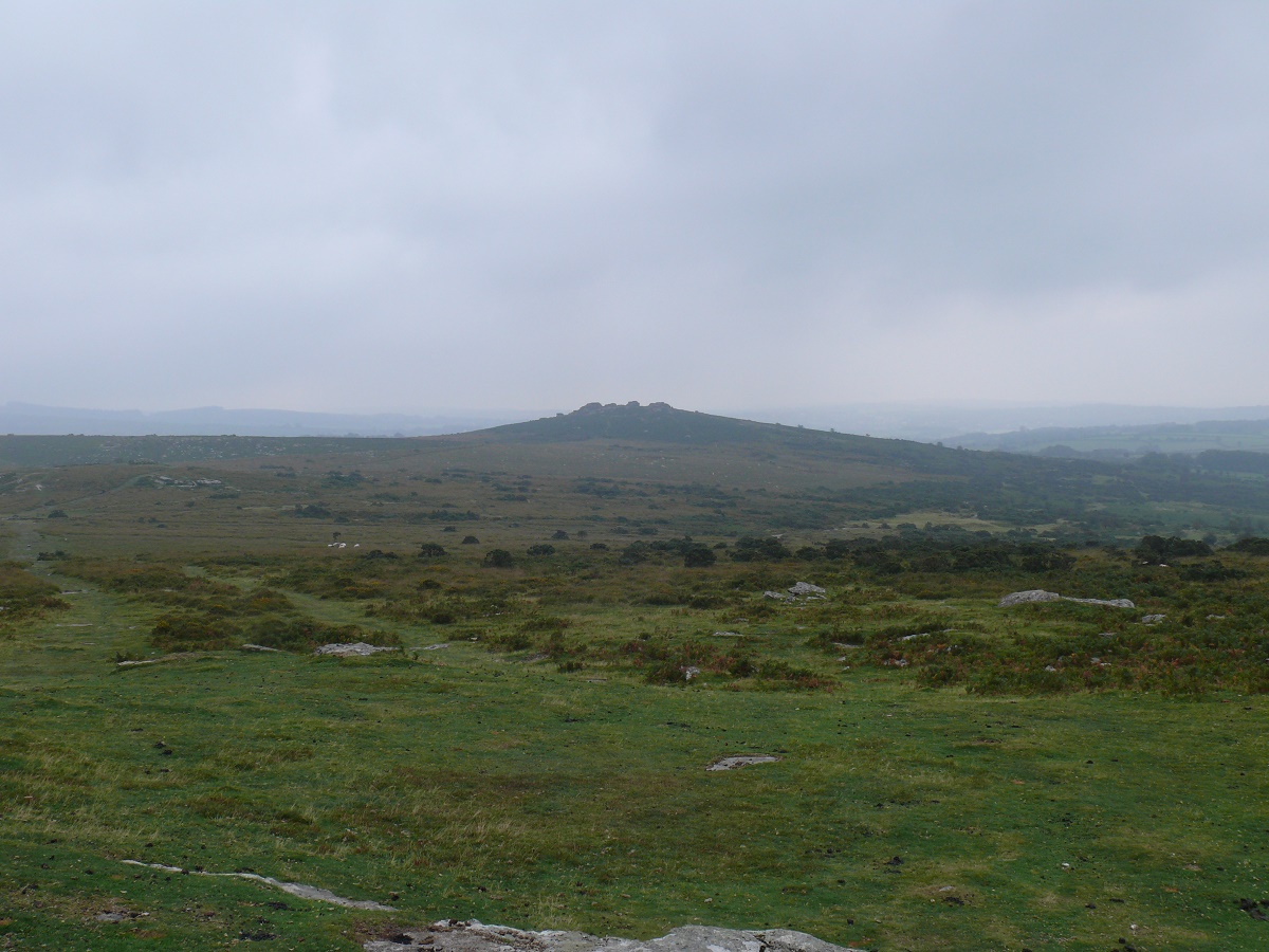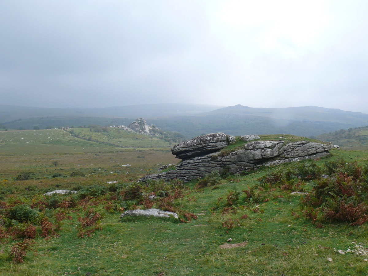 Pew Tor summit looking back to a murky Cox Tor left and the Staple Tors right