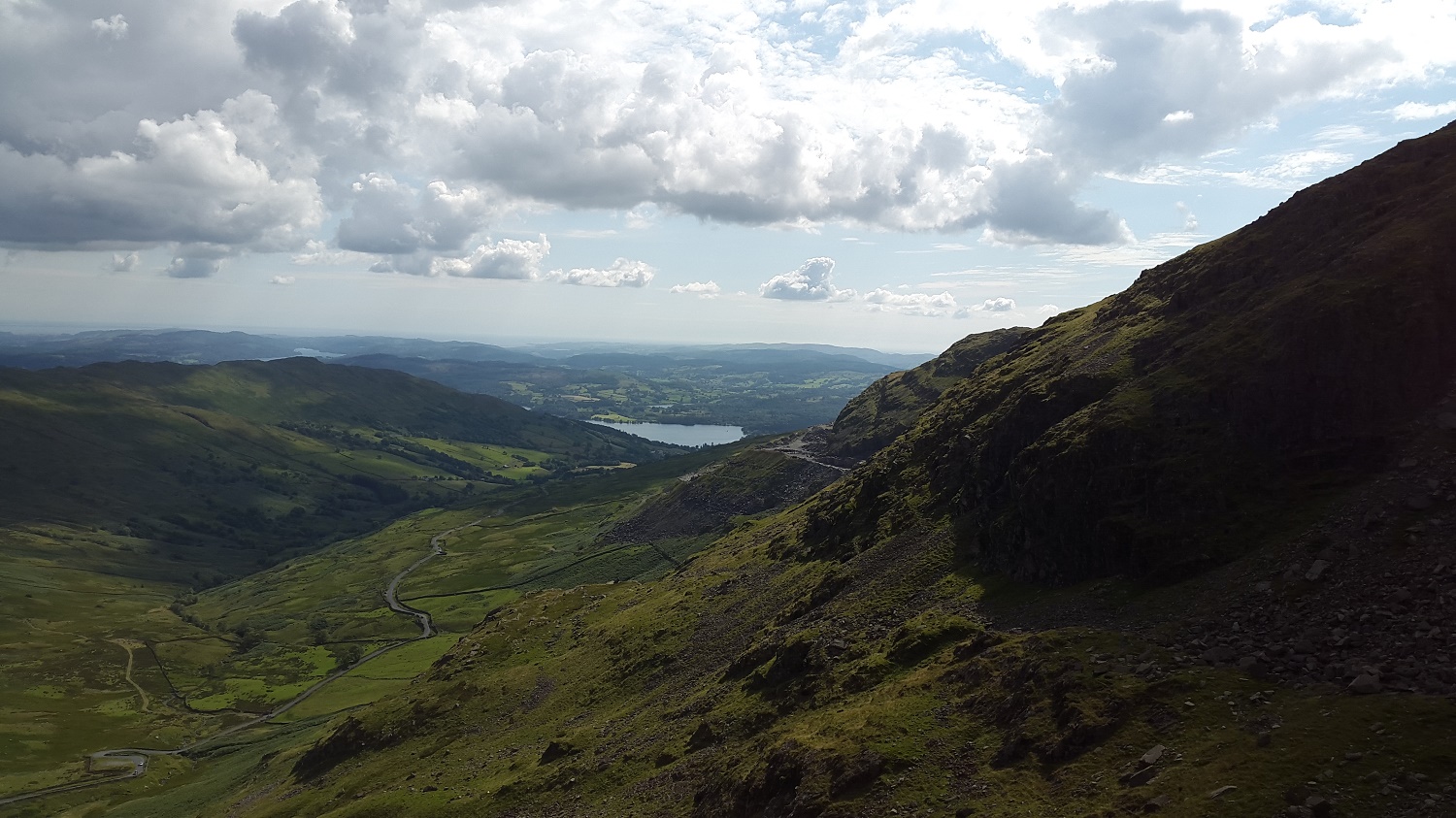 Climbing steeply looking down to the pub, the road wiggling away to the right (The Struggle) heads to Ambleside.