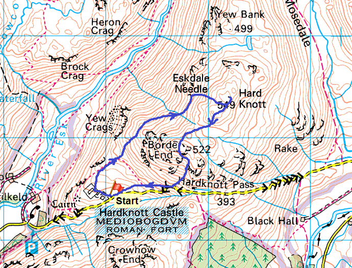 | Route – Yew Crags – Eskdale Needle – Hard Knott – Border End – Hardknott Pass – Hardknott Fort |