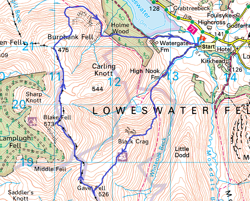 | Route – High Nook Tarn – Gavel Fell – Blake Fell – Burnbank Fell – Holme Wood – Maggie’s Bridge |