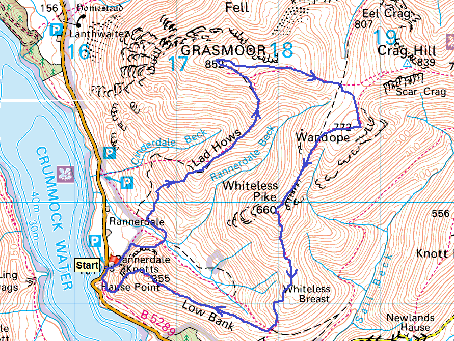 | Route – Rannerdale – Lad Hows – Grasmoor – Wandope – Thirdgill Man – Whiteless Pike – Whiteless Breast – Rannerdale Knotts – Hause Point |