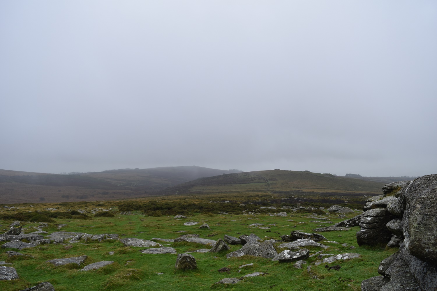 Wittaburrow left, Tunhill Rocks can just be seen in the dip centre with Pil Tor in the cloud again right.