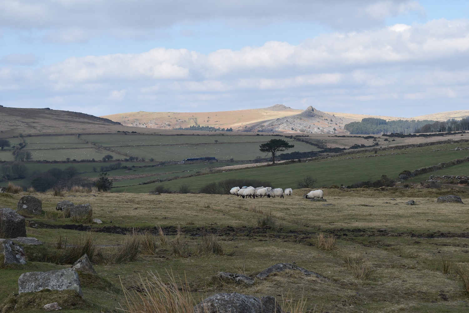 Zoomed in over the sheep to Leather Tor (looking like a pyramid) and Sharpitor behind