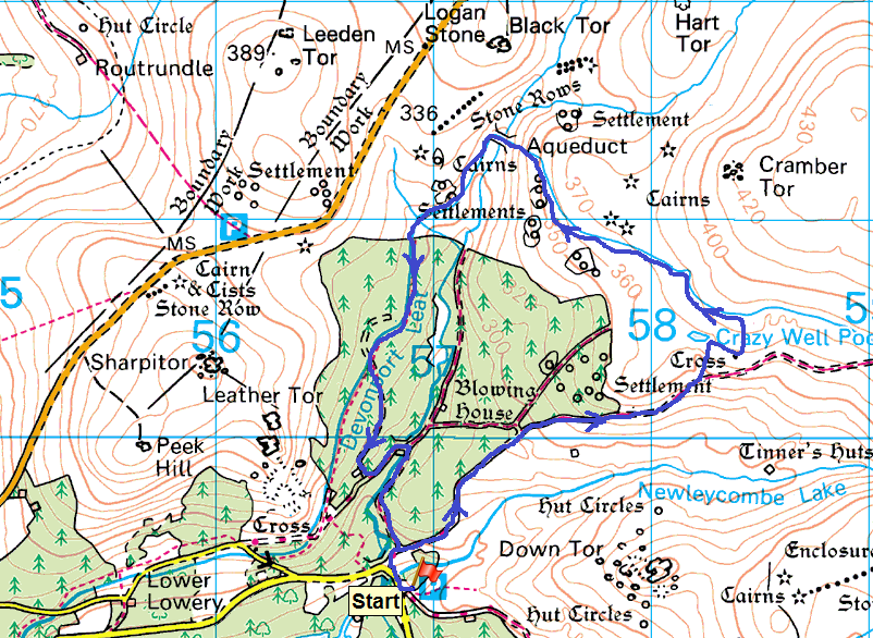 | Route – Crazywell Pool – Crazywell Cross – Devonport Leat – Raddick Hill – Leathertor Farm – Leather Tor Bridge – Norsworthy Bridge |