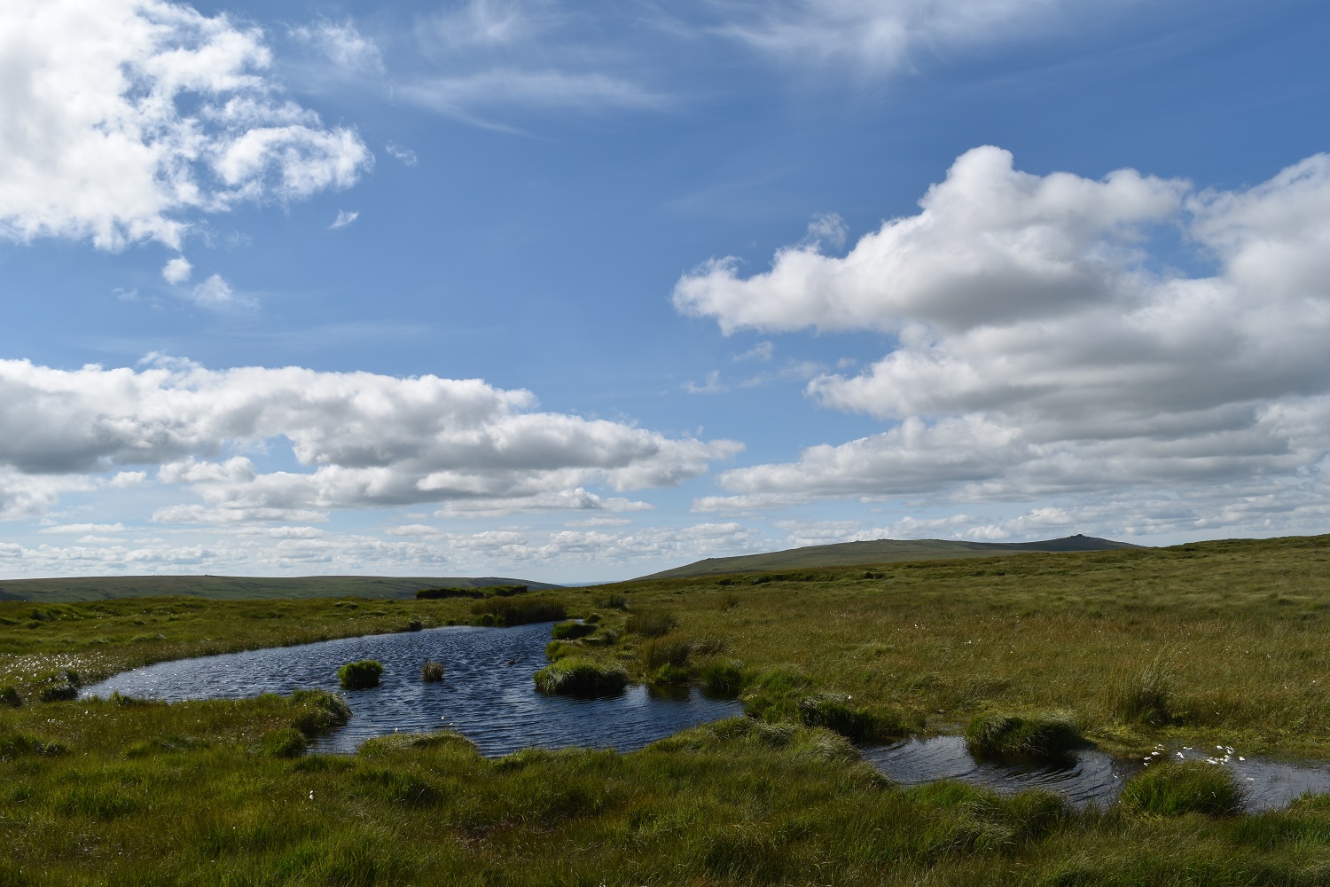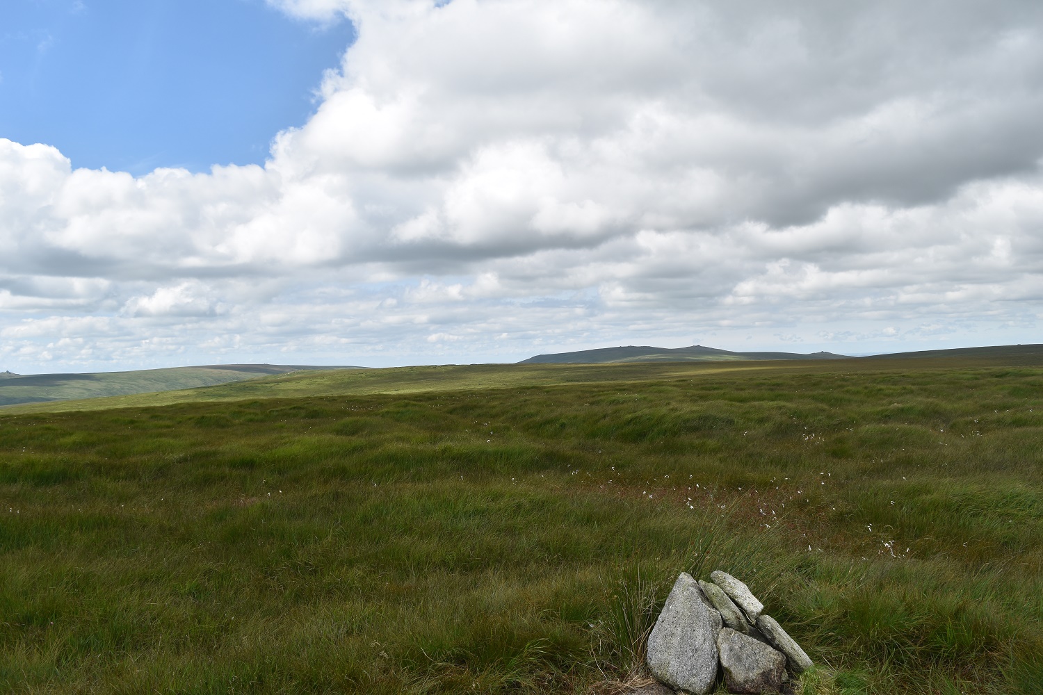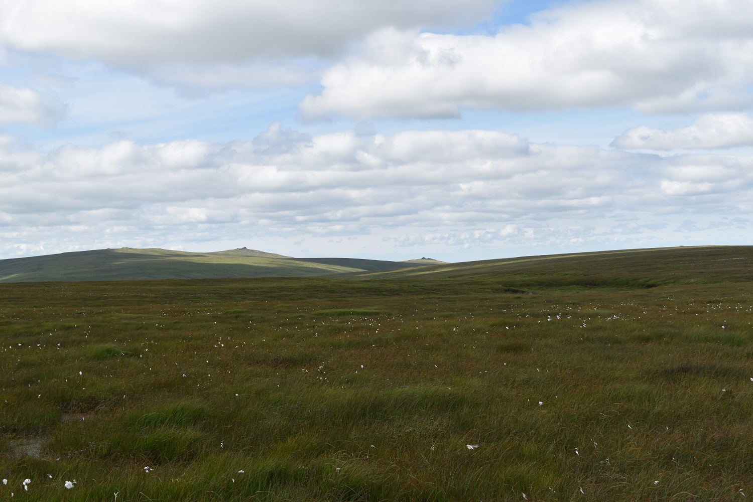 Now nearly at Cranmere Pool, depression on the centre right, with Yes Tor catching the sun in the distance