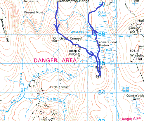 | Route – Rowtor – West Mill Tor – Little Tor – Dinger Tor – Brim Brook – West Okement River – Great Kneeset – Black Hill – Cranmere Pool – Ockerton Court – Okement Hill – East Mill Tor – New Bridge – Rowtor parking |