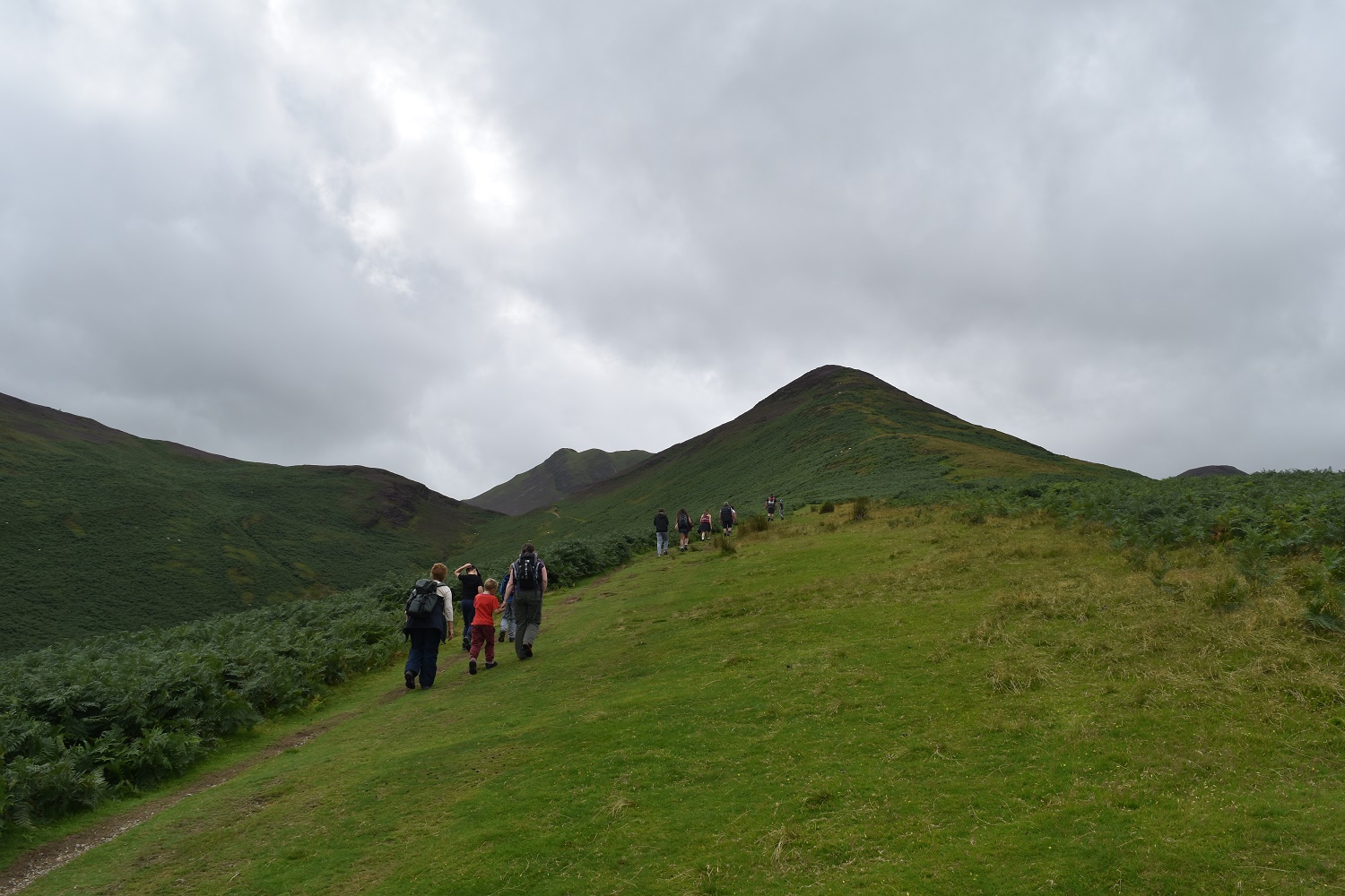 Off again, heading for the dip to the left of Stile End ( pointy peak dead ahead). Causey Pike is the knobbly one at the back and Outerside can just be seen peeking up on the right of Stile End.