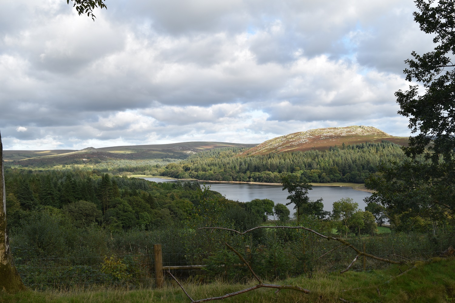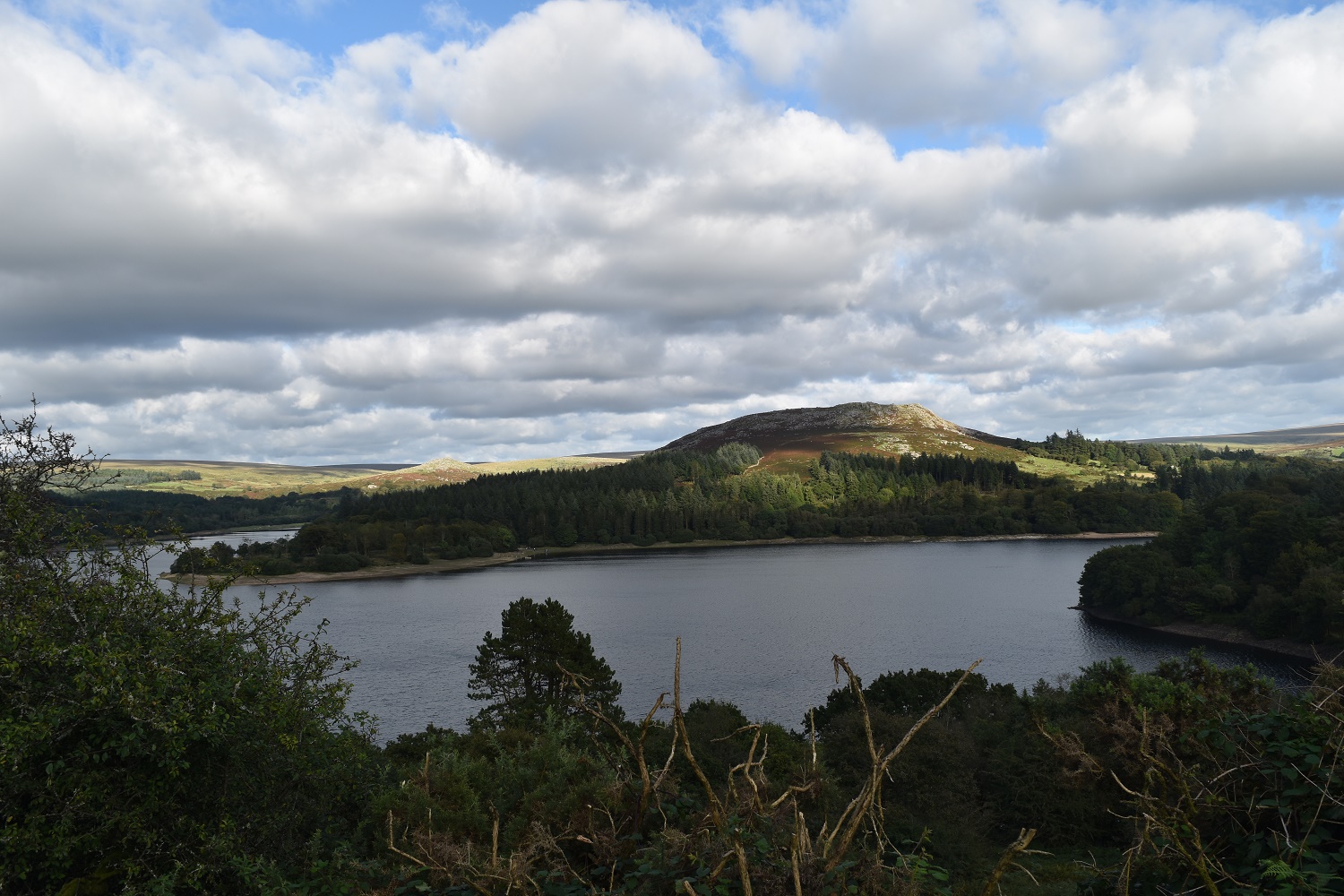From the dam, across the reservoir with Peek Hill and Leather Tor up on the left