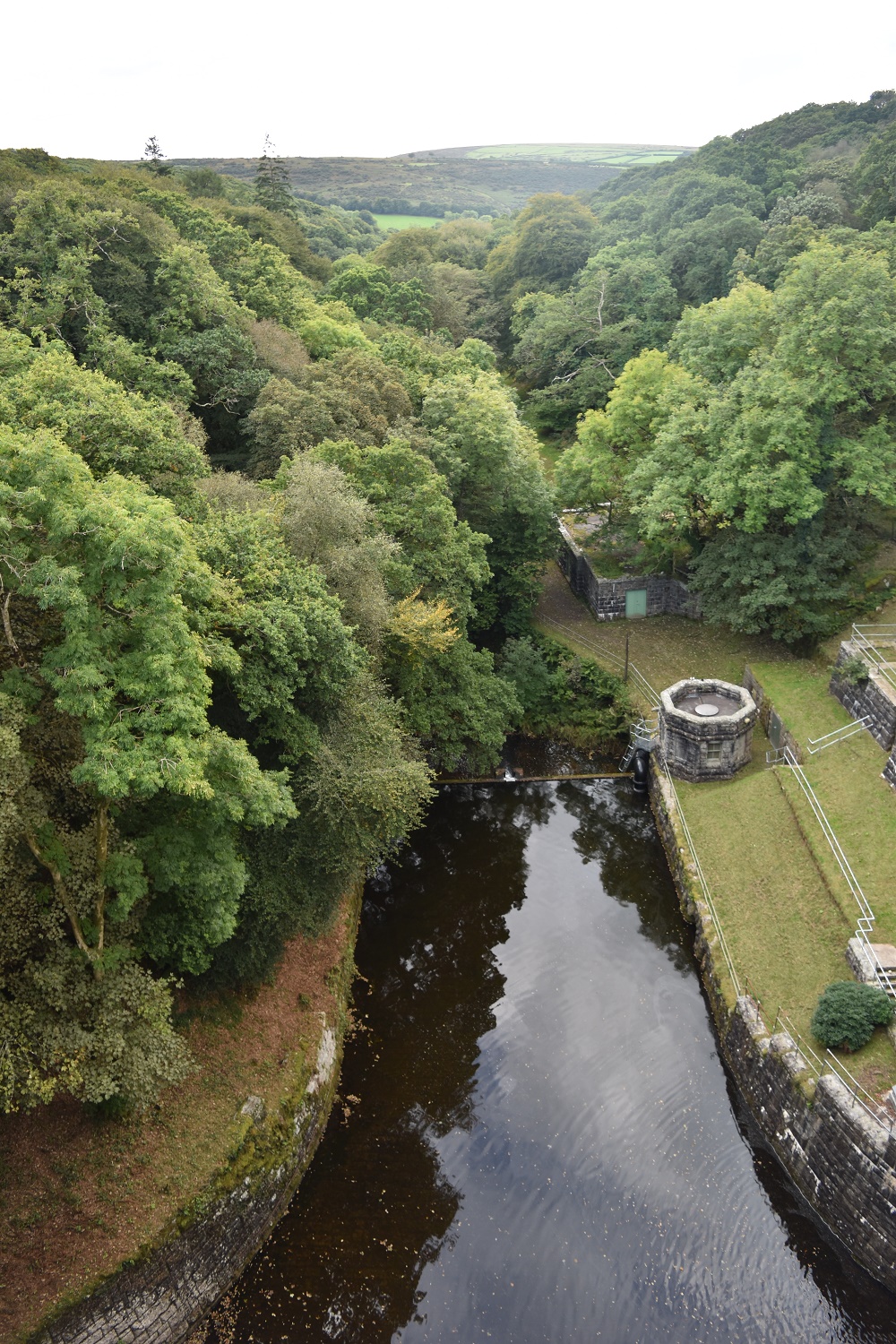 Back on the dam at the end of the walk, looking down the outflow which is the River Meavy