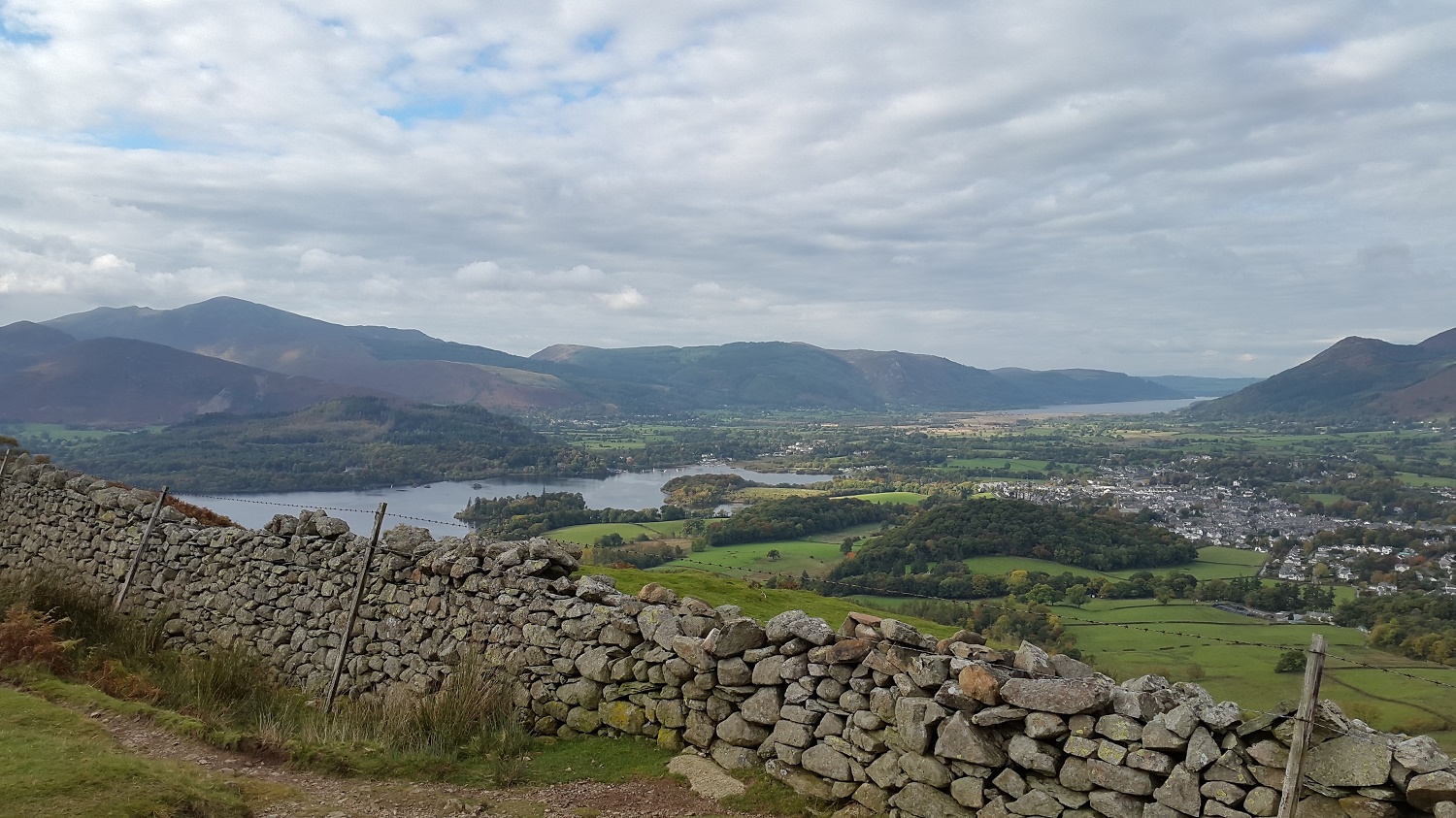 Looking back to Walla Crag, Skiddaw behind with Derwent Water and Bass Lake to the left