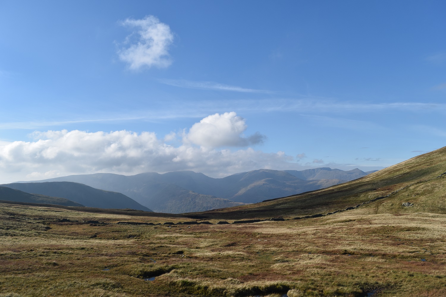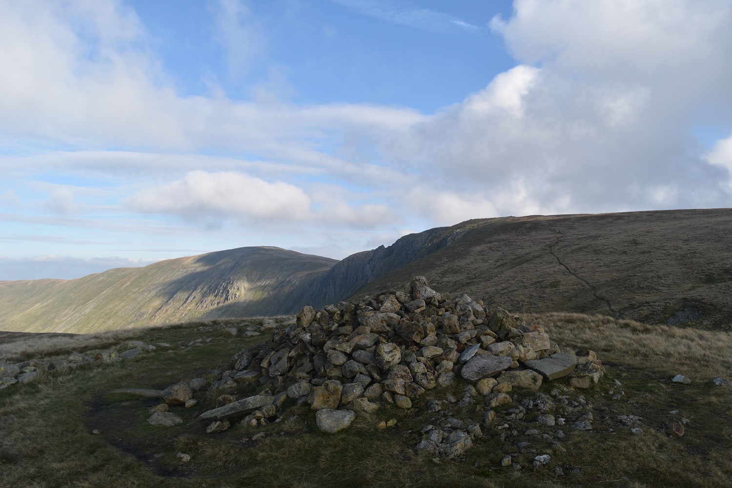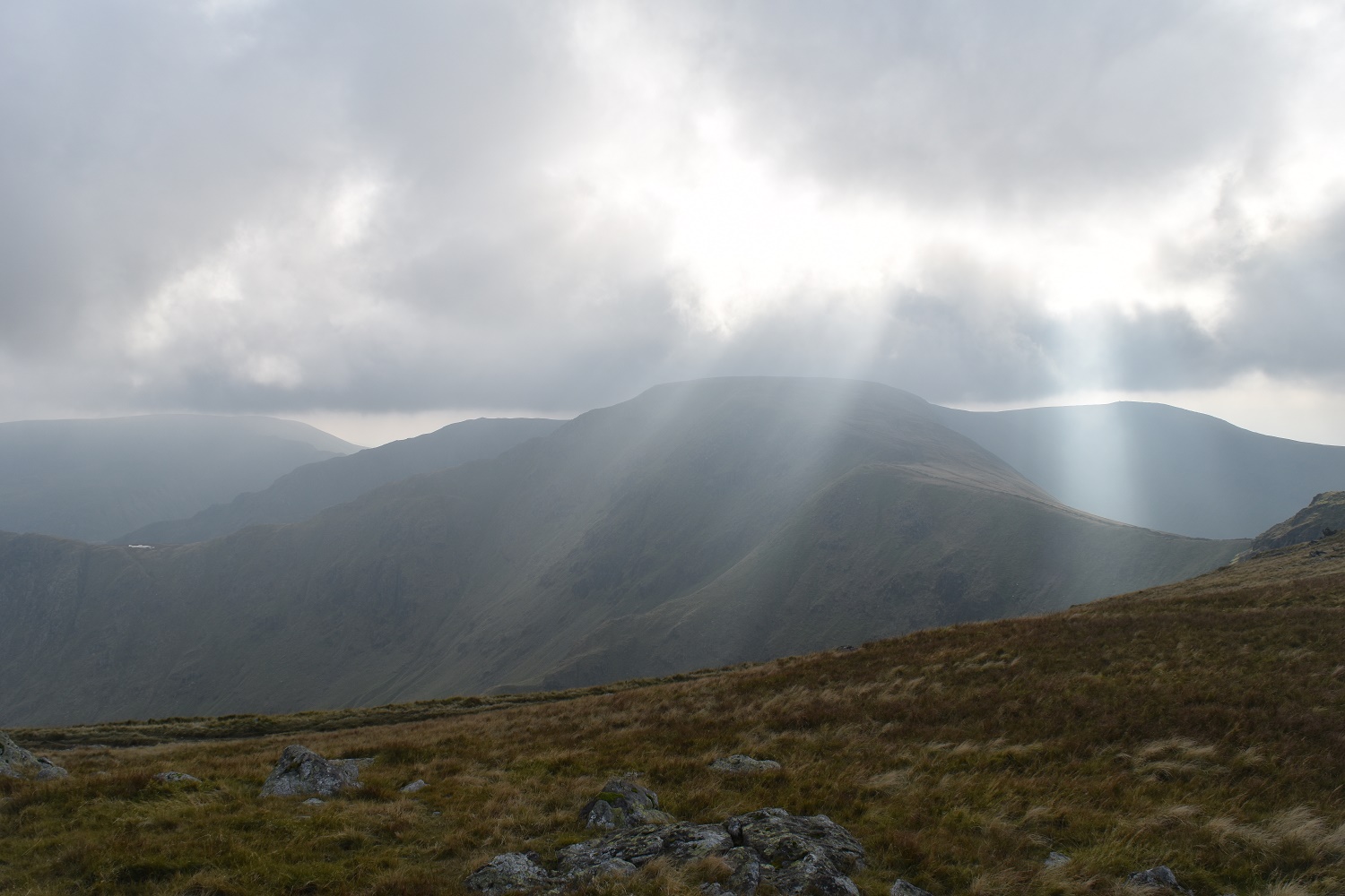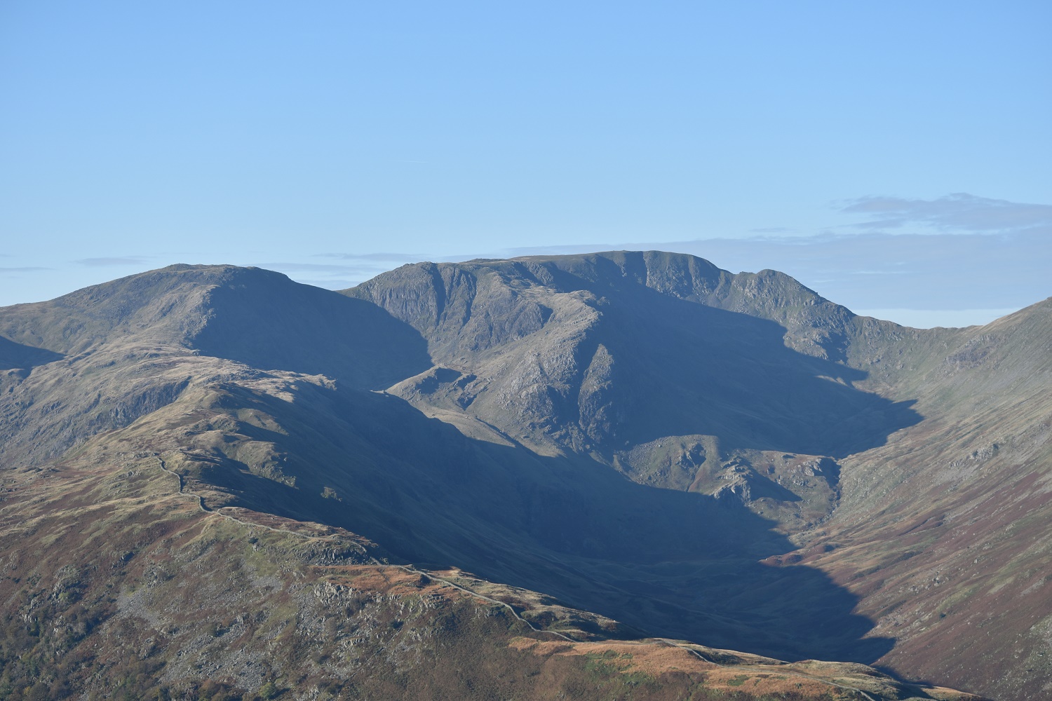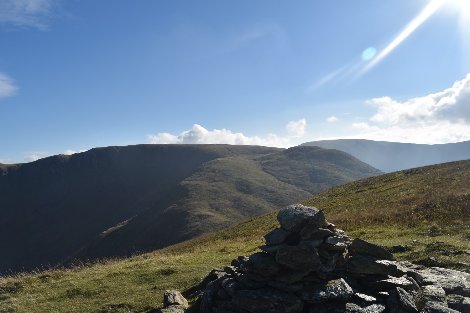 On The Nab you get a great view of Helvellyn and its surrounding edges. Striding Edge runs from right to left across the middle of the photo, with Catstycam the pointy fell