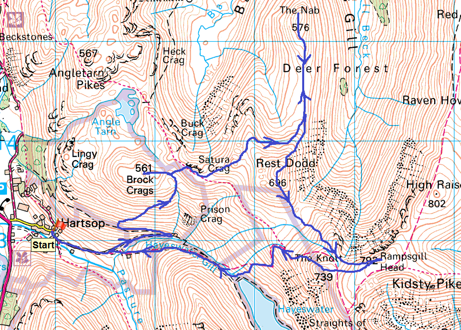 | Route – Brock Crags – Satura Crag – The Nab – Rest Dodd – Rampsgill Head – The Knott – Hayeswater Gill – Hartsop |