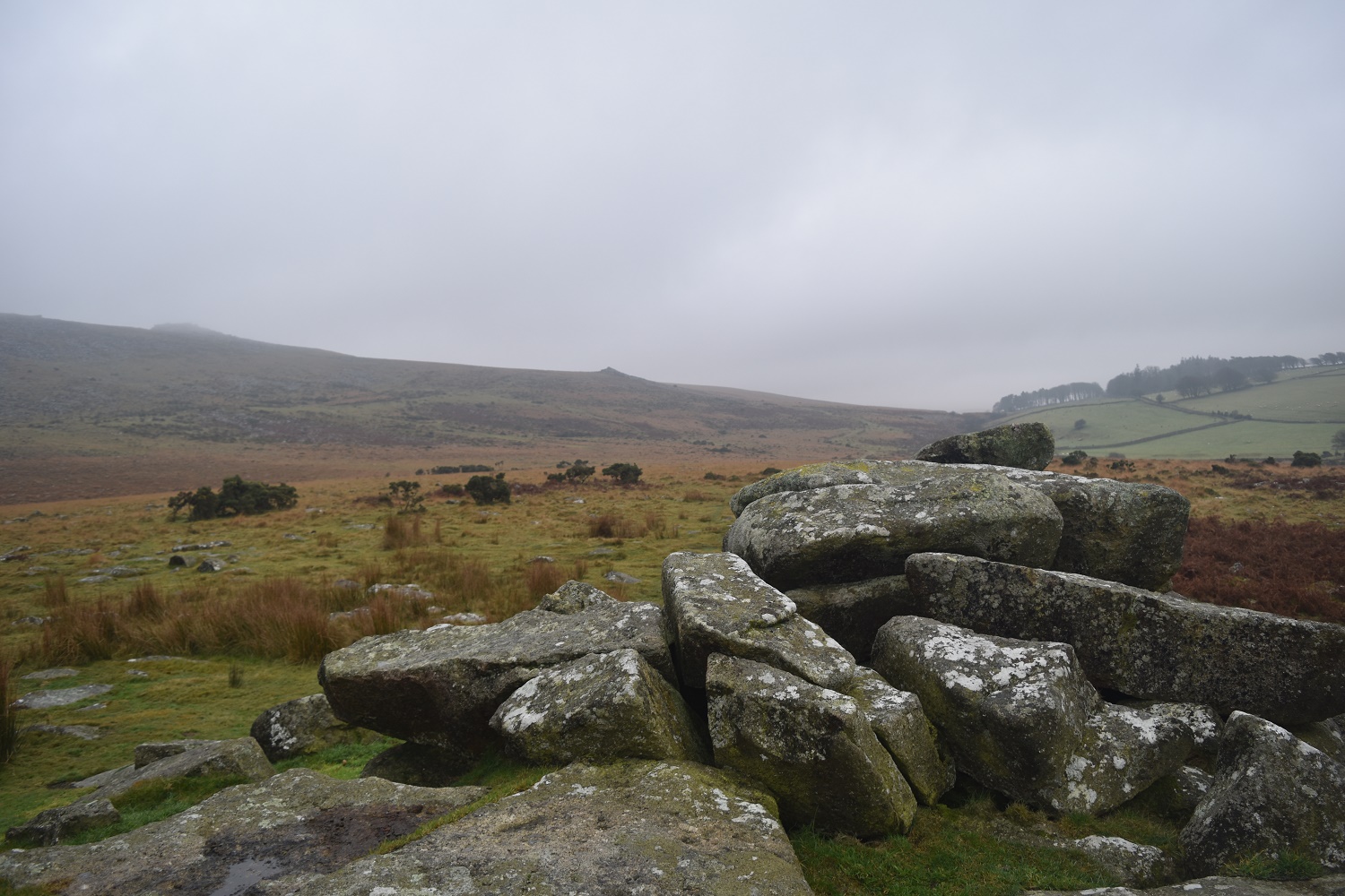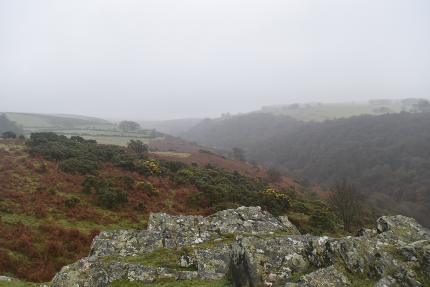A walk around northern Dartmoor, and a part I’ve not visited before. When you head up along the road to Okehampton Camp your eyes are drawn to the higher tors of West Mill Tor and Yes Tor, as a result you speed past the hills and tors around Moor Brook and the East Okement River. Today I was putting that right, although I reckon if I had planned on heading to Yes Tor or anywhere above 350metres above sea level then I would have changed plans!! The mist/fog/low cloud/clag, call it what you will was down, in abundance! There was little in the way of a view, the weatherman had said cloud, this was just a lot lower than I expected!! Still there was hope, clear skies promised by 6pm meant that at some point it would start to clear and the cloud level would rise, hopefully!! Even so, the walk through the woods, alongside the East Okement was brilliant and a place I would very much recommend.