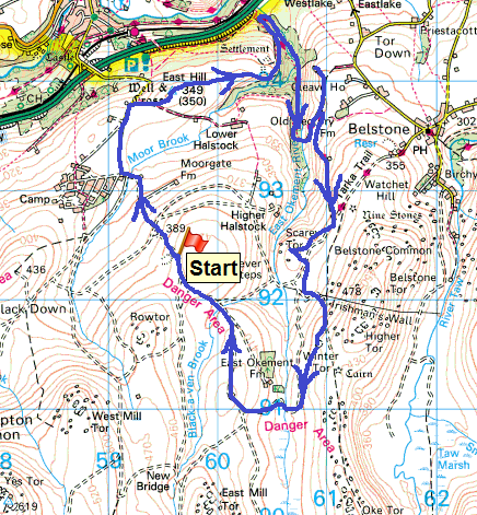 | Route – Okehampton Camp bridge – East Hill – Ashbury Tor – Chapel Ford – Cleave Tor – Tarka Trail – Scarey Tor – Winter Tor – Henrys Ford – Hart Tor OP22 – Rowtor parking |