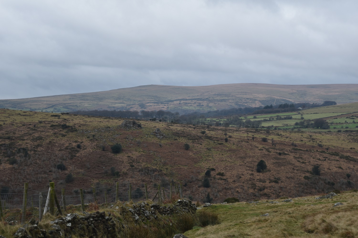 Looking back along the Erme valley with Tristis Rock on the hill on the right