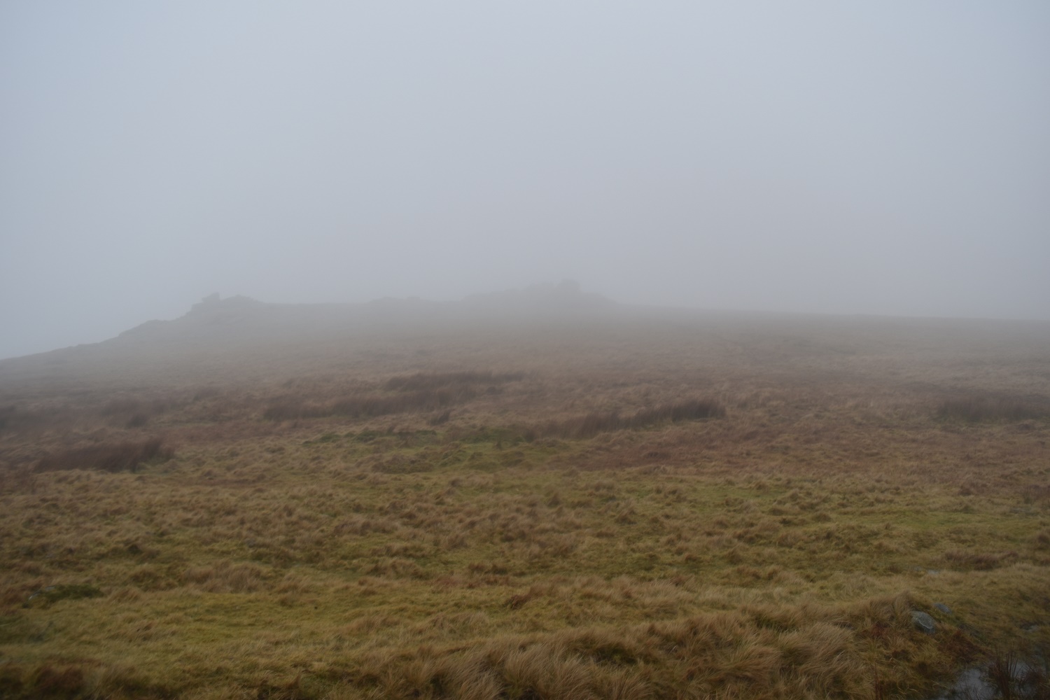 I’m at the summit nearly of Arms Tor with sideways rain and a gale blowing, I make a run for those rocks up there and hunker down for an impromptu meeting with myself over the next course of action.