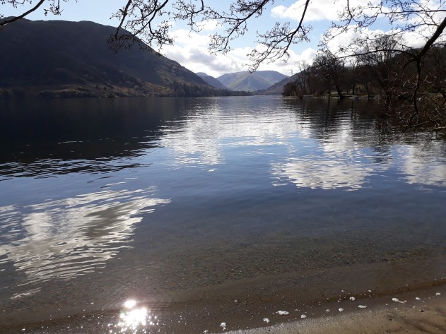 The trees thin and give this fantastic view to a dark looking Place Fell on the left and St Sunday Crag in the distance