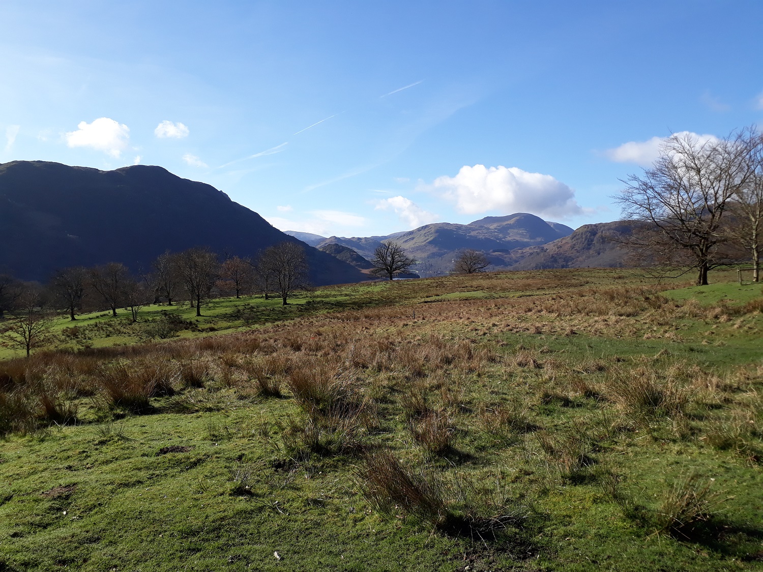The trees thin and give this fantastic view to a dark looking Place Fell on the left and St Sunday Crag in the distance