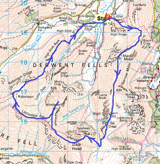 Route – Yewthwaite Comb – Hause Gate – Maiden Moor – High Spy – Dale Head Tarn – Dale Head – Hindscarth Edge – Hindscarth – Littledale Edge – Robinson – High Snab Bank – Newlands Church – Little Town parking