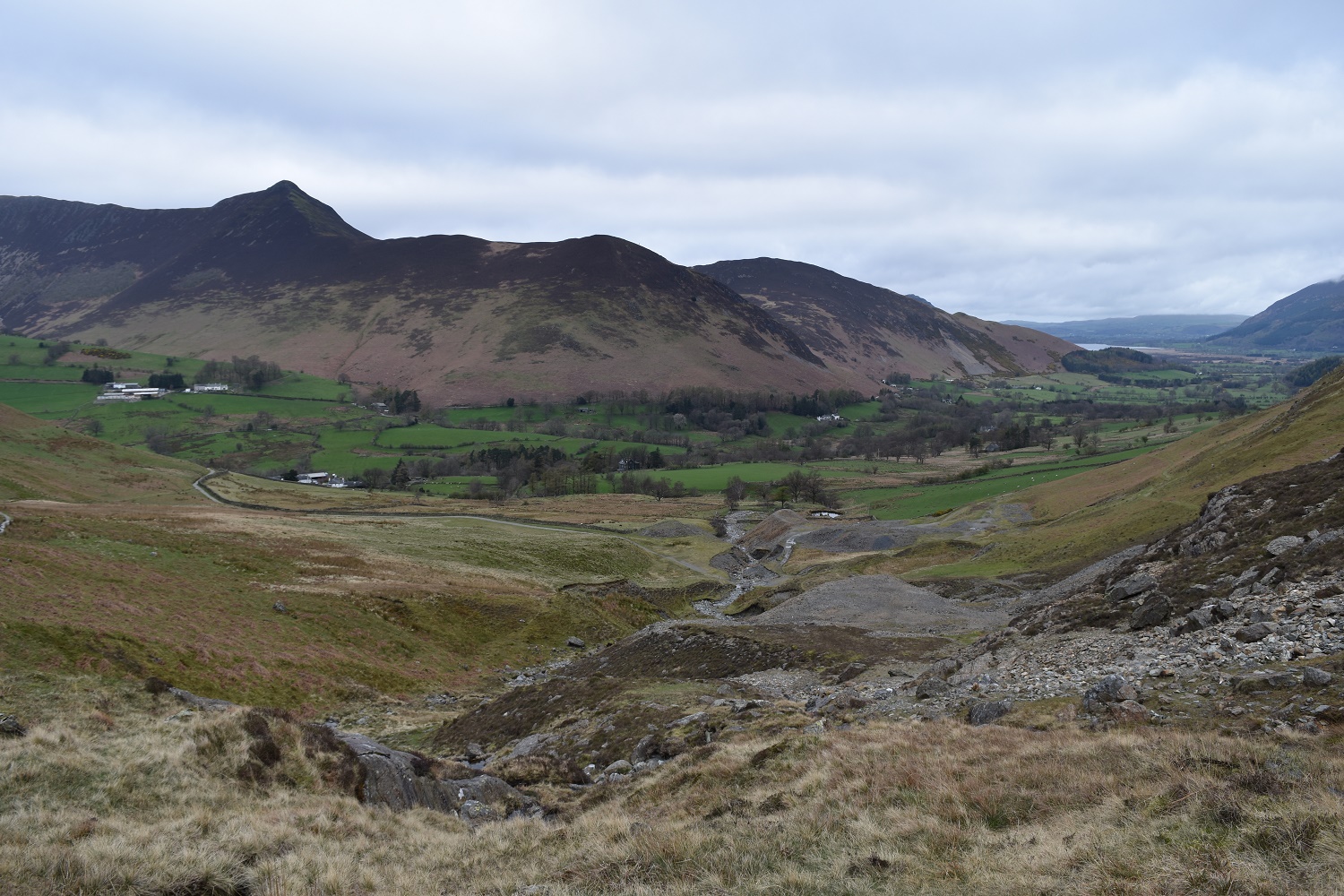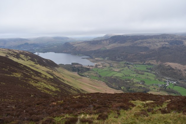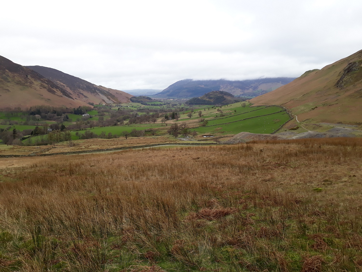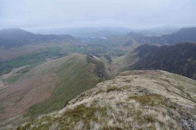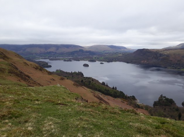 Newlands valley left with Bassenthwaite Lake beyond, then Catbells and to the right of that Derwent Water