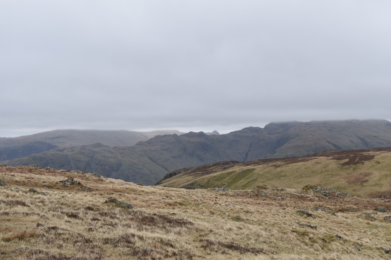 The knobbly summit of Bessyboot (Rosthwaite Fell) looking very dark, Pike O’Stickle is also behind that. Glaramara is up in the clouds to the right