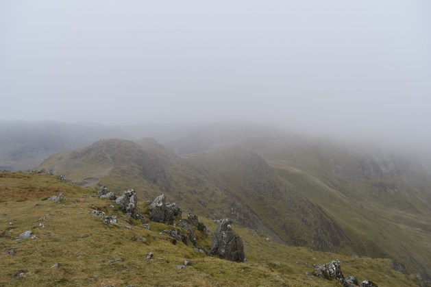 a few hundred metres north you drop out of the cloud to look along the descent of High Snab Bank