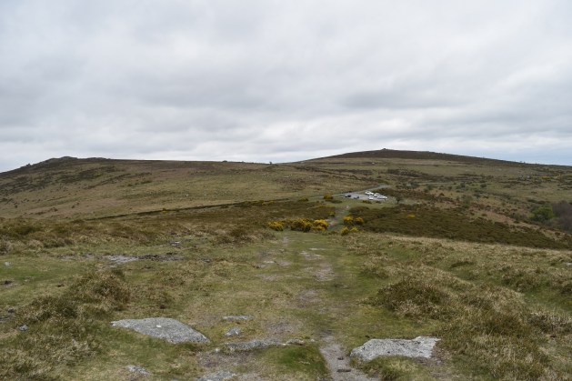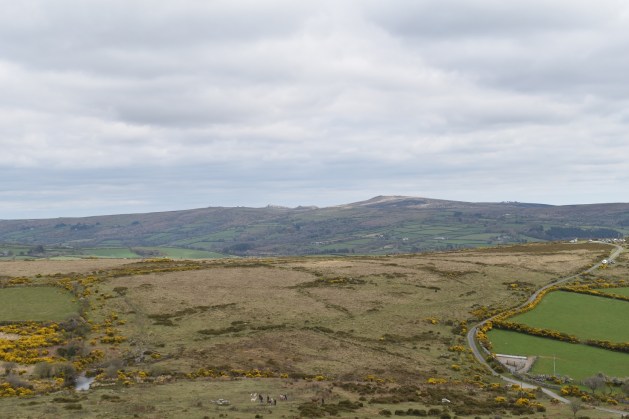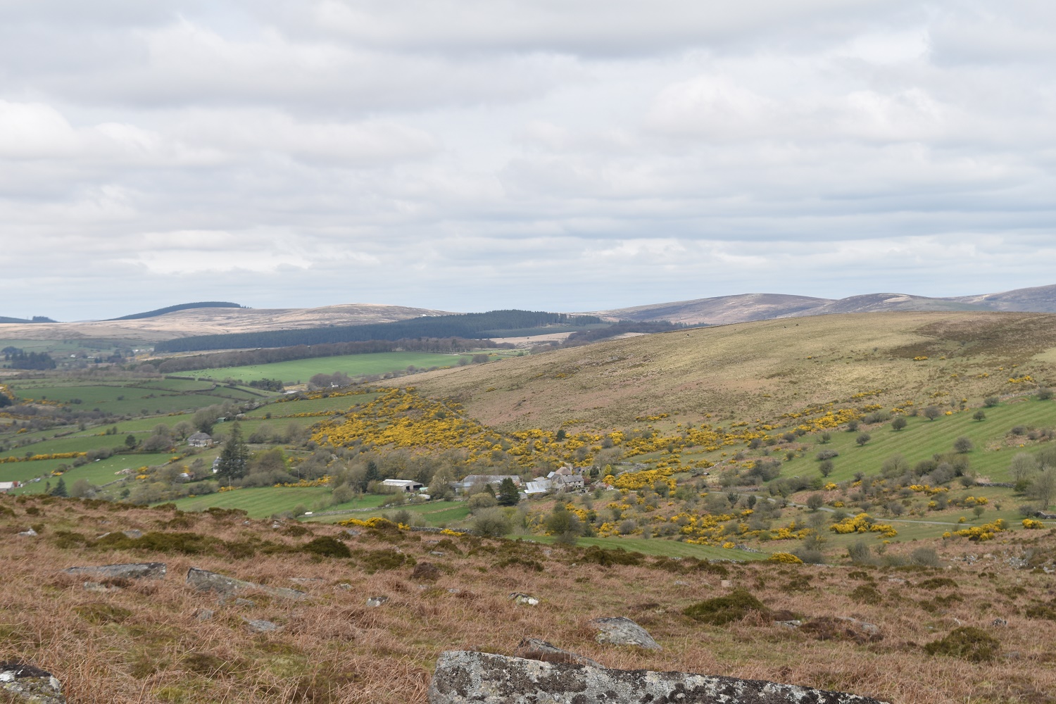 Heading down to Vag Hill I get a strong smell of gorse flower, Mel Tor up on the left and North Tor to the right. The farm is Rowbrook