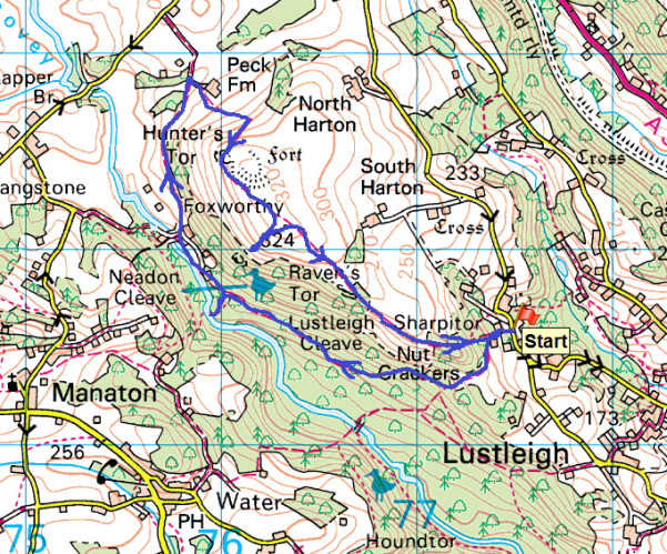 | Route – Lustleigh Cleave – Horsham Steps – Foxworthy – Peck Farm – Hunter’s Tor – Raven’s Tor – Foxworthy Tor – Harton Chest – Sharpitor – Hammerslake Tor – Lustleigh parking |