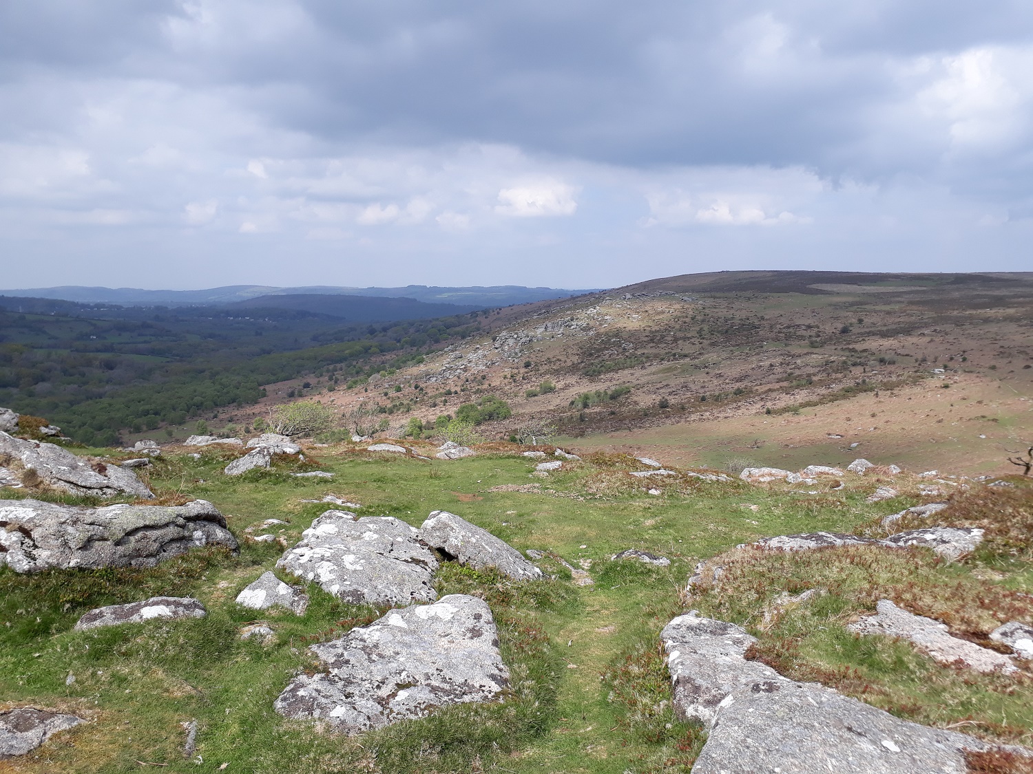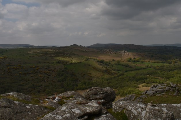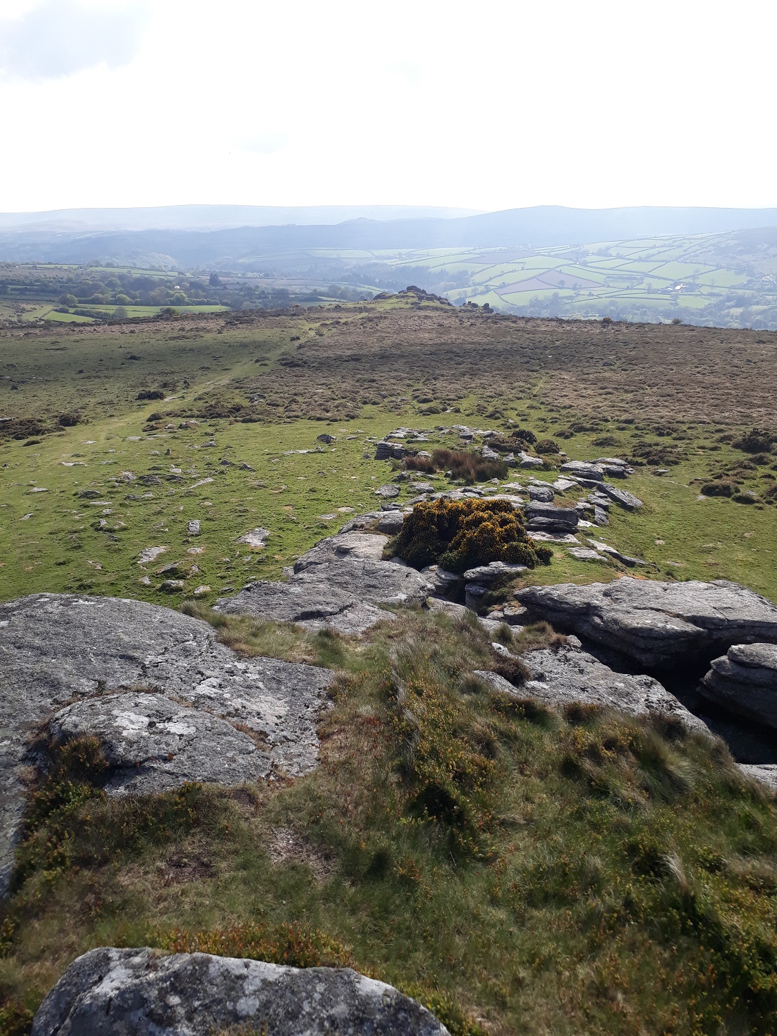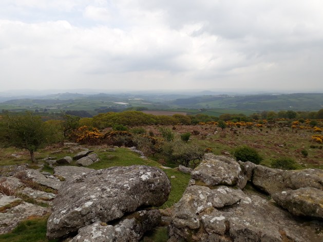 The gorse at the moment is smelling as good as anything on the moor, Bag Tor has a lot of it. I’m looking across a hazy South Hams here
