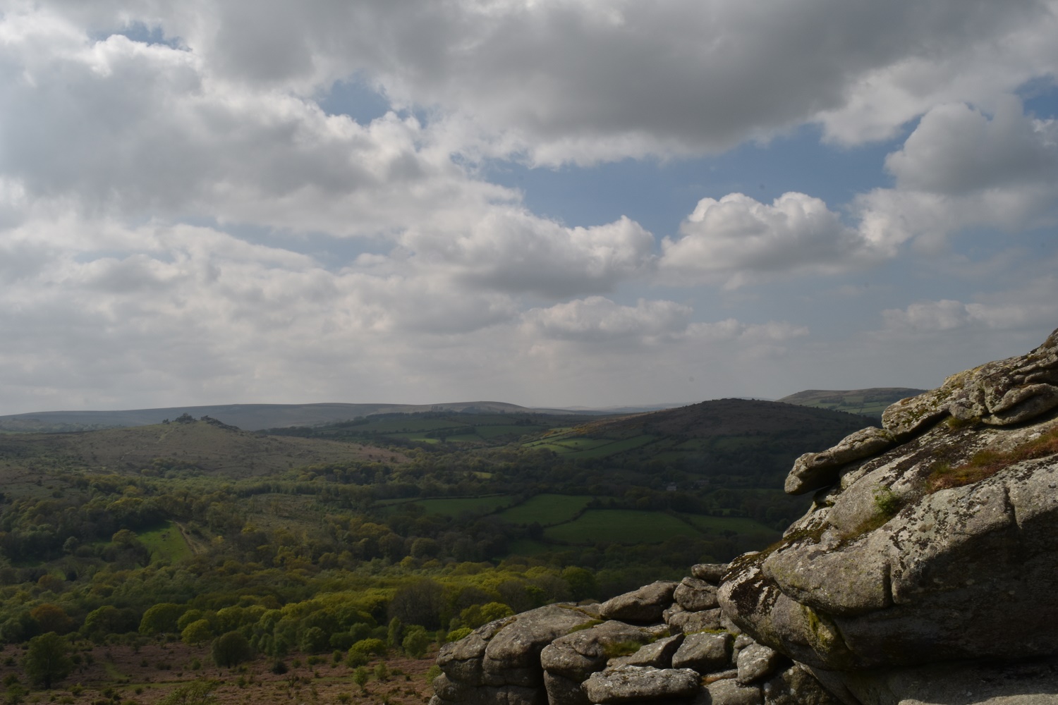 A long down from Leighon Tor through woods, and a steep up brings you out by Greator Rocks, this is the view to Hound Tor