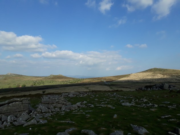 Starting out along the path to Rippon Tor, looking back to the car park down there. Long distance views look a bit hazy at the moment