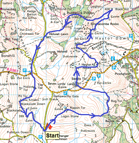 | Route – The Nutcracker – Rippon Tor – Bag Tor – Saddle Tor – Emsworthy Rocks – Haytor – Holwell Tor – Smallacombe Rocks – Hole Rock – Black Hill – Leighon Tor – Becka Brook Clapper Bridge – Greator Rocks – Holwell Lawn – Top Tor – Pil Tor – Tunhill Rocks – Wittaburrow – Cold East Cross parking |