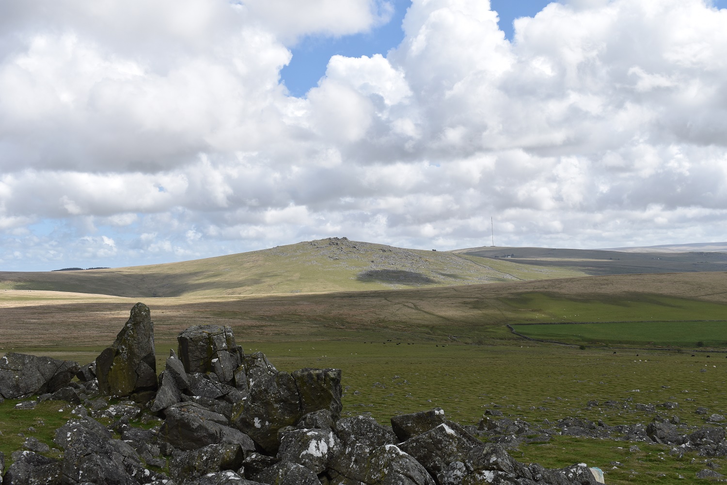 Looking dark to the north, with Ger Tor at the front, Hare Tor up to the left, catching the sun behind you can just see Sharp Tor and Great Links Tor is back left