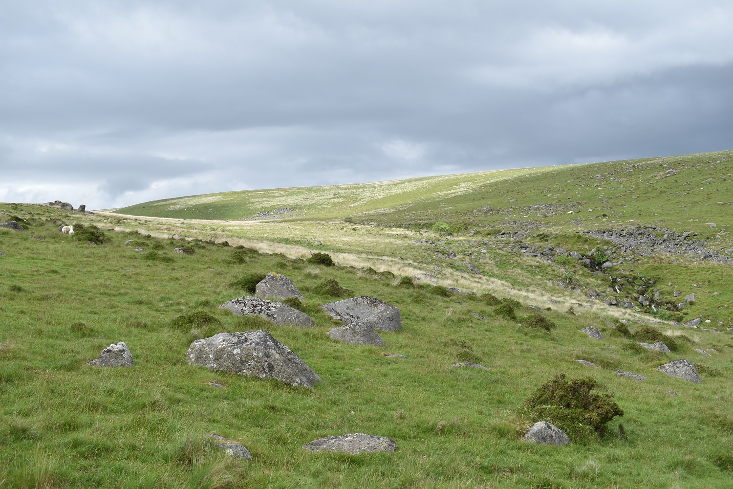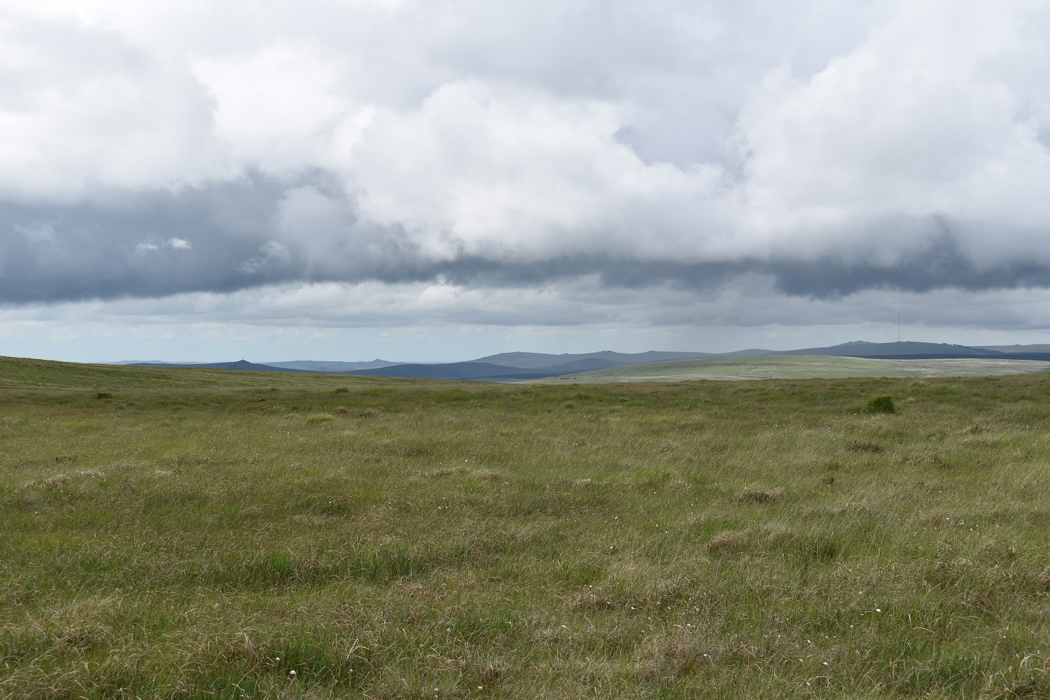 On Langcombe Hill, with pointy Leather Tor left and the mast on North Hessary Tor in view to the right