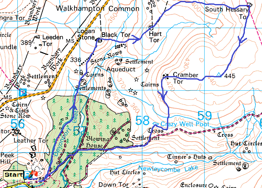 | Route – Devonport Leat – Black Tor(Walkhampton) – Hart Tor – South Hessary Tor – Cramber Trig – Cramber Tor – Crazywell Cross – Crazywell Pool – Leather Bridge – Leathertor Farm – Cross Gate Cross |