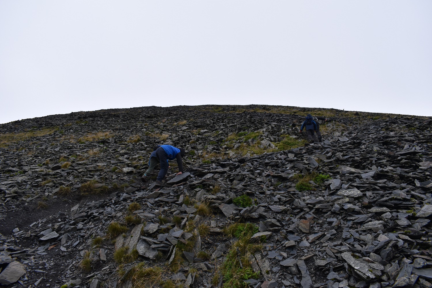 The long summit ridge, now in cloud. Second time I have walked here with the summit mainly clear only for it to cloud over as I summit. Still spirits are high