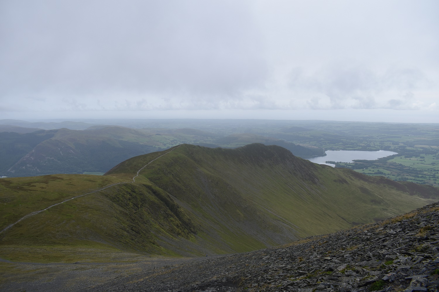 This is the first of 4 walks on this visit to the Lake District this summer. The boys wanted to beat their previous highest mark (which was the Old Man of Coniston at 803m). We were staying in Braithwaite and the mountain of Skiddaw overlooks this village, it seemed an obvious choice. So 4 children and 3 adults set out from beside the A591 to climb to the Ullock Pike ridge. The route up to Skiddaw along Longside Edge is a classic trail and has the bonus of adding 3 more Wainwrights to the total on top of that of Skiddaw. Now I have climbed Skiddaw this way once before, back when I was seventeen. Myself and my brother made a rather poorly equipped summit of this mountain. On that day the weather was also dry but as we made our way up the finally slate climb the cloud dropped. Surely that couldn’t happen again, could it.