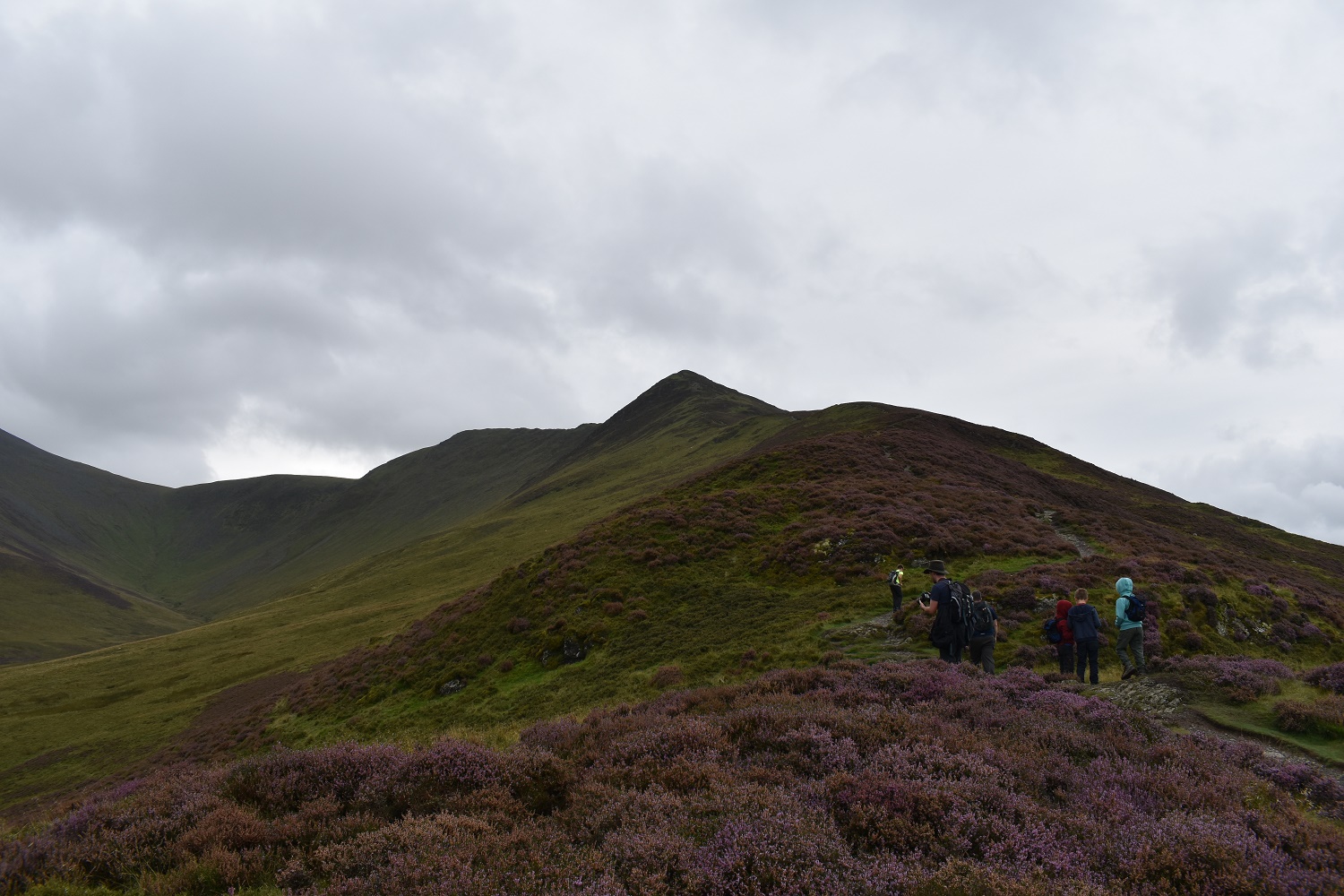 Heather in bloom and the long ridge back left is the Helvellyn group