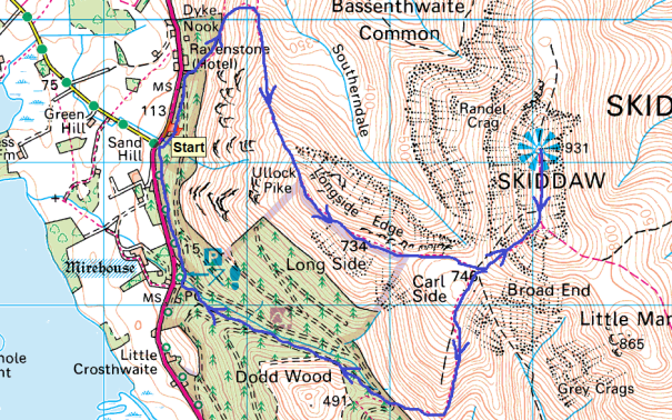 Route – Dodd Wood – Ullock Pike – Longside Edge – Longside – Carlside Tarn – Skiddaw – Carlside Tarn – Carlside – White Stones – Long Doors – Dodd Wood – Sawmill Tearoom – Alongside the A591