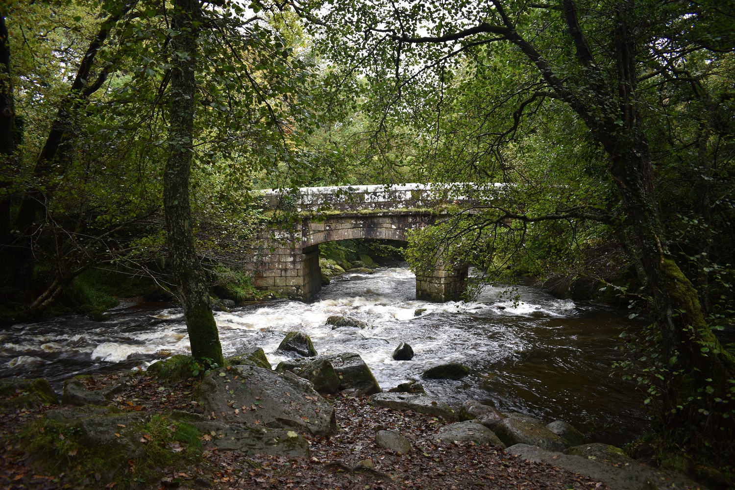 Shaugh Bridge, the river Plym is on the left and the river Meavy on the right going forward under the bridge it is just the River Plym