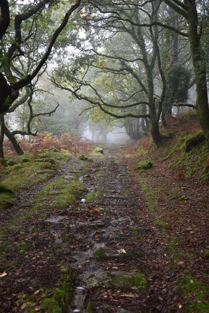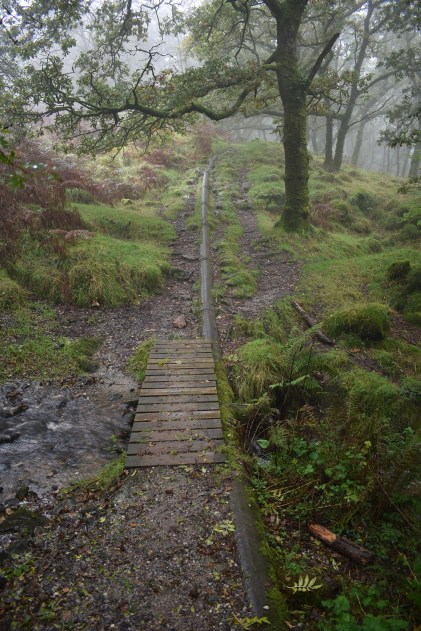 Up again into the mists. This part of the track shows the railway sleepers a bit better, there is also a brake house at the top which helped to keep the carts from crashing down into the river Meavy at the bottom