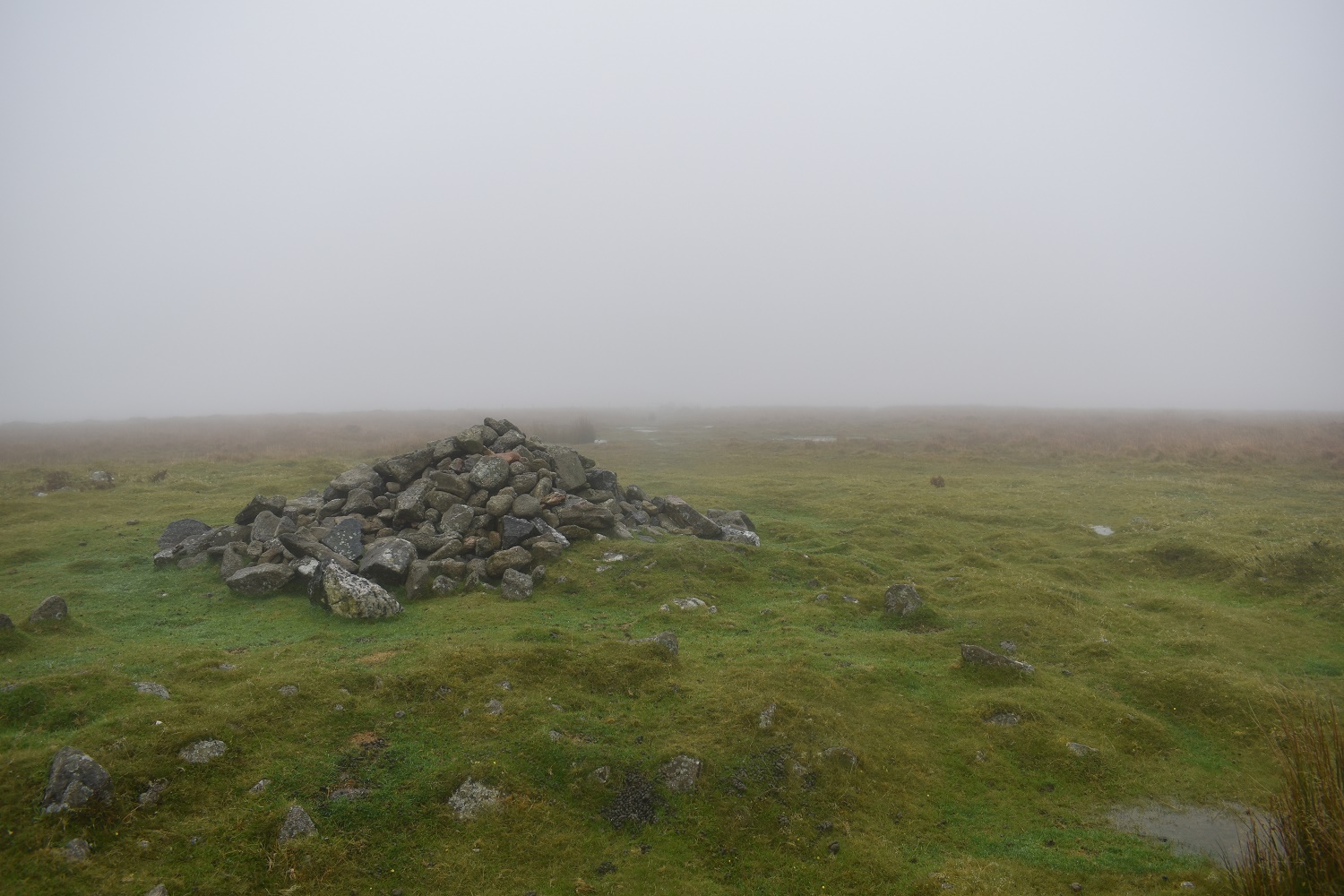 The cairn on Wigford Down which would normally have a backdrop of Dartmoor tors
