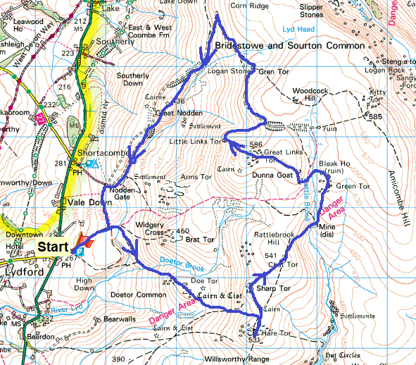 | Route – Lydford Bridge and steps – Doetor Bridge – Doe Tor – Hare Tor – Sharp Tor – Chat Tor – Rattlebrook – Green Tor – Bleak House – Lower Dunna Goat Tor – Higher Dunna Goat Tor – Great Links Tor – Little Links Tor – Rattlebrook railway – Gren Tor – Lydda Bridge – Great Nodden – Nodden Gate – Lydford parking |