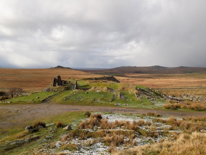 Sunshine is brief as we reach Foggintor quarry, those are the broken buildings that used to be in use when the quarry was in full swing, which was from the 1770s up to 1906. Kings Tor and the Staple Tors are beyond