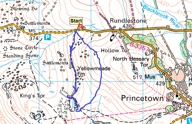| Distance – 1.5 miles Start time – 11.25am Time taken – 1hr 15mins Highest Point – Hollow Tor 472metres |