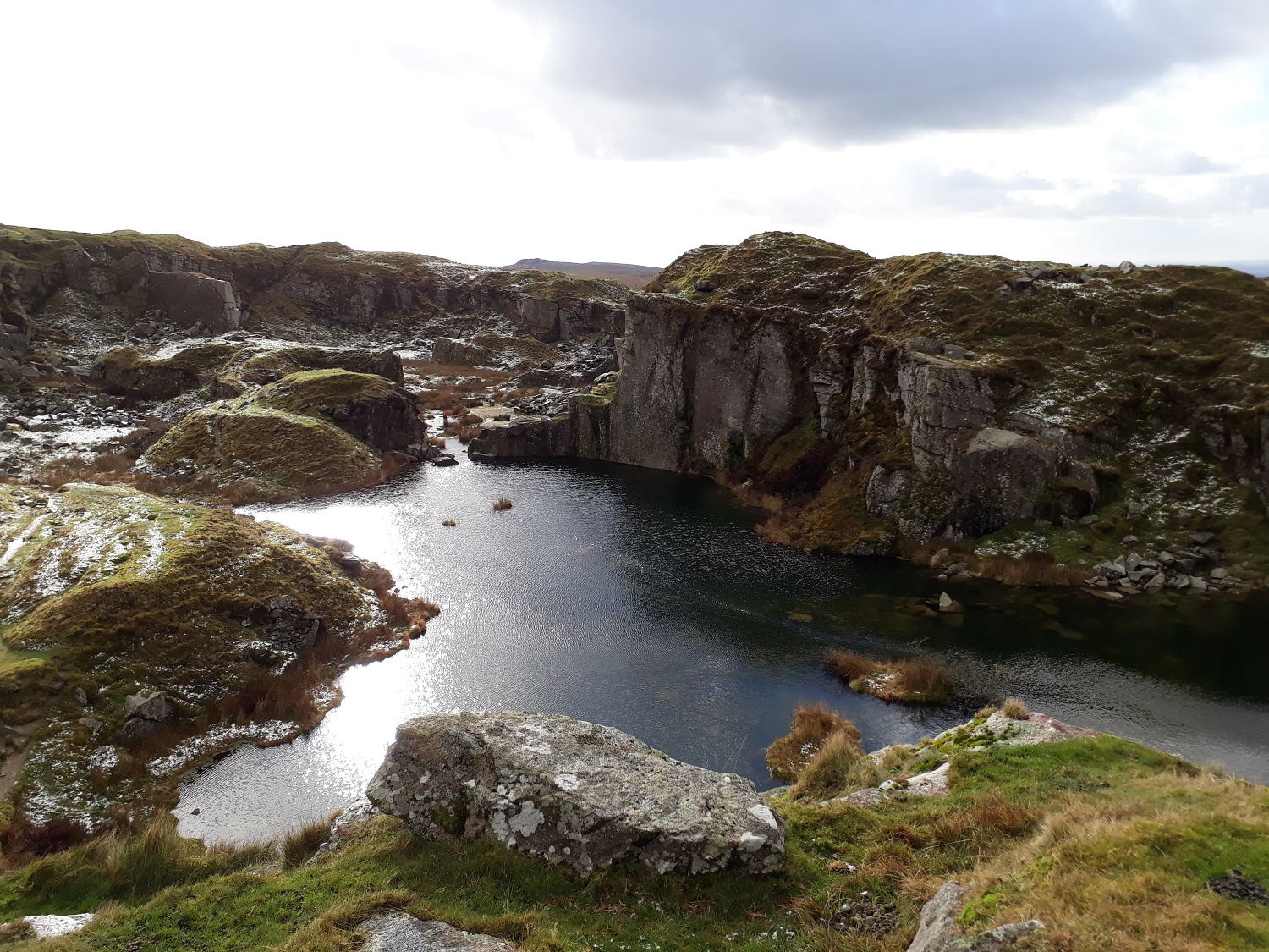 Sunshine is brief as we reach Foggintor quarry, those are the broken buildings that used to be in use when the quarry was in full swing, which was from the 1770s up to 1906. Kings Tor and the Staple Tors are beyond