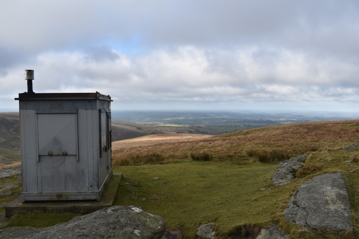 Great Links Tor pops up above the Slipper Stones. The military hut here on Fordsland Ledge can be seen for miles around in this area