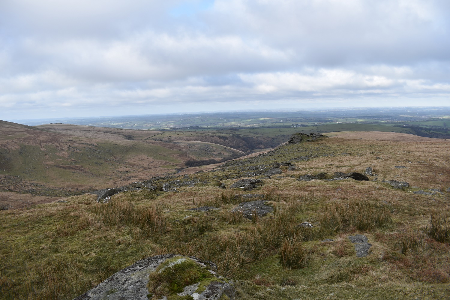 Finally a sunny day in Plymouth, the forecast looked great for Dartmoor so off I went. However on the drive north along the western edge of Dartmoor, cloud loomed in my preferred walking area. My heart sank a bit and I walked for 4 hours in cloud before it cleared for the remainder to a azure blue sky and perfection. I set out today looking to get up to the high points of Dartmoor from a different direction for me. However the wind was very strong and I decided to keep down a bit. Saying that, Fordsland Ledge, my high point today, is only a few hundred metres from High Willhays and in the top 10 high points on Dartmoor. This walk basically loops around the West Okement valley, firstly along the east side then hitting the southern point of Lints Tor, before looping back along the western side. Now I don’t like the western side in the main. In fact I will happily state here that Stenga Tor is horrible. It looks like a snail from a distance and the ground around it has the consistency of a snail trail. Its grim and today took it down further in my estimation as my boot went through icy ground into thigh deep claggy mud. This is bog country and I had to crawl out and roll across to find firm ground again. Using the Bear Grylls strategy of heading back the way I came I managed to extricate myself!! The Slipper Stones offer great views, as does all this ridge, but the ground is hard work and it will be a while before I go back to Stenga Tor. I was glad for the sun all the way back as the majority of my lower clothing was wet and cold. Still this is a great walk, just pick a hot summer to do it!!